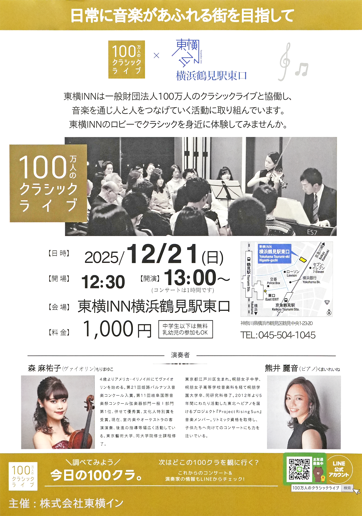 2025年12月21日(日)東横INN横浜鶴見駅東口さまで「100万人のクラシックライブ×東横INN」が開催されます。