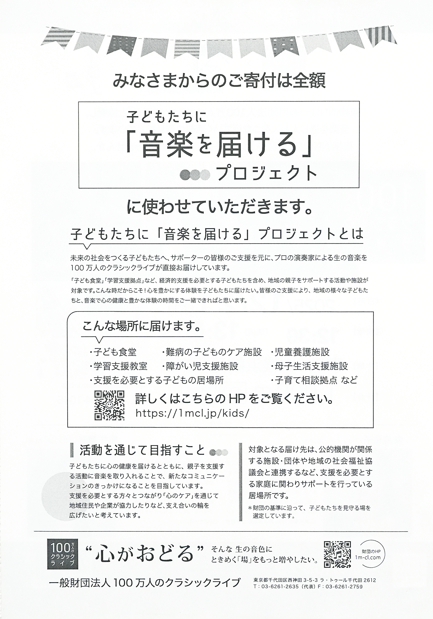 当日の料金(¥1,000)は全て寄付として、経済的支援を必要とする子どもたちを含め、地域の親子をサポートする活動や施設を対象としたプロの演奏家による生の音楽を直接届ける “子どもたちに「音楽を届ける」プロジェクト” として使われます。